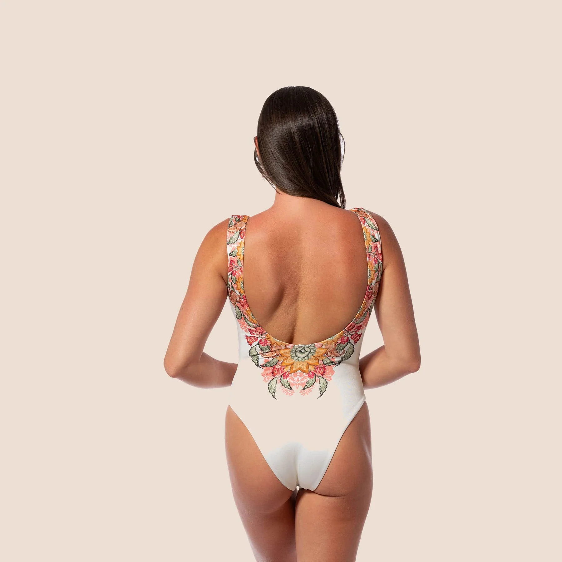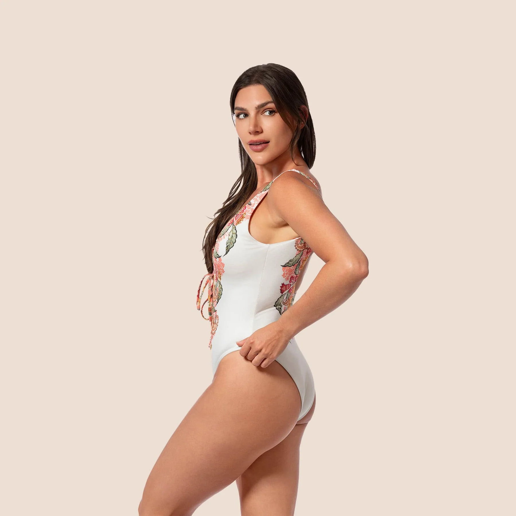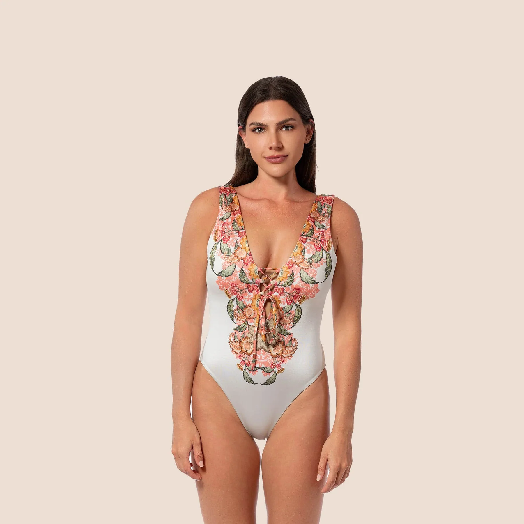 Nuestro traje de baño Abloom Plunge presenta un escote pronunciado con detalle de cordones. Es un estilo sobre los hombros con un escote pronunciado en la espalda.